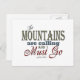 This custom postcard features a popular typography design that says 'The mountains are calling and I must go.', which is a famous quote by Naturalist John Muir. The words are different fonts and different colours of sky blue, forest green and dark red. Show your love for the mountains!