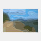 A bright, colourful abstract design of a mountain view, with blue sky, rock and trees.