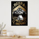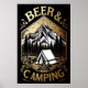 A graphic illustration depicts a mountain range with a campsite at its base. A tent is pitched in front of a crackling campfire, and a beer bottle rests on the ground. The scene is framed by a hexagonal design with the text Beer & Camping in a gold script.