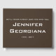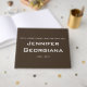 This elegant funeral/memorial condolences guestbook features the message "We’ll never forget our time with you,", and the personalised name and birth/death dates of the individual who has passed away. It could be used to record cherished memories of somebody who has recently passed away. The text is coloured white, and the background is a dark brownish grey.