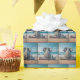 Grey mouse and elephant sitting on a driftwood log staring at the ocean