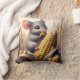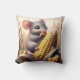 A cute wide-eyed mouse is nibbling on a large ear of corn in a cornfield with a sunlight background