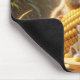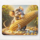 A happy mouse enjoys corn on the cob with melting butter while sitting on a wooden surface surrounded by scattered corn kernels