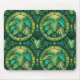 "Mouse pad with a tropical leaf motif, featuring vibrant green leaves in a circular, stained-glass style pattern. A white mouse is shown on the pad."
