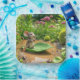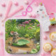 A small mouse navigates a muddy puddle using a curled leaf as a boat, surrounded by vibrant pink and white flowers and lush greenery