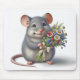 A smiling grey mouse holding a wildflower bouquet isolated on a white background