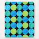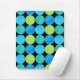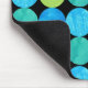 A vibrantly coloured Mousepad with a 'Blue Moons' abstract pattern in bright blues and neon green on a black background; from a handpainted paper collage design by Judy Adamson.