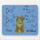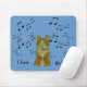 Orange striped cat with white face and chest is surrounded by multiple flying musical notes. Customise by changing the blue background to a colour of your choice.