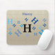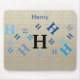 Letter (or number) of your choice will go with the personalised Name that will show at top in blue. Letter will appear as a large central letter in black, surrounded by four slightly smaller letters, and 12 even smaller letters (in shades of blue) that are jumbled around the central letter. Background is textured "linen" in beige.