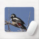 Pretty, spotted woodpecker, sitting on a snowy branch in the blue sky