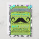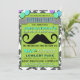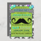 Moustache Bash Chevron Birthday Party Invitation. Your party will be all the rage when everyone brings their moustache to the birthday party. This kids boy birthday party invite features a neutral grey background with stars abound and green chevron overlay that holds all your party text. A grey banner towards the top read "Birthday Party" Just in case anyone was wondering. Blue, black and white serif text is laid out in a very trendy and hip poster style layout and a huge moustache is a stand out as well on this invite. A very hipster invite for any birthday part whether you are an adult or child!