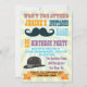 Hip and fun moustache birthday party invitaitons with moustache, bowler derby hat and sunburst poster like faded antiqued background with bold graffic fonts. Great for any age or gender. Change out the wording "birthday party" to any type of party you'd like, such as a bachelor or bachelorette party. Hand drawn illustration by McBooboo. Please contact me with any questions, changes or problems!