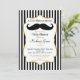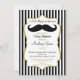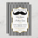 An elegant black and gold moustache baby shower invitation featuring faux gold glitter accent frame and black and white stripes with gold and black text and a fun black moustache. This elegant boy baby shower invite is just the ticket.