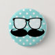 Moustache and glasses flair button on blue polka dot background is cute and trendy.