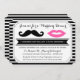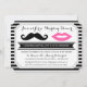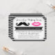 These moustache and lips themed wedding shower invites are retro hipster cute! Invites feature moustache and lips, calligraphy, modern typography, a ribbon flag, and an ornate frame over a chic black and white stripes pattern background.