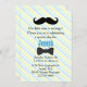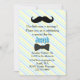 Whimsical baby boy's first birthday party invitation done in a pastel blue, green, yellow and white diagonal stripe, with a moustache little man theme. Personalise the text for your son's special day.
