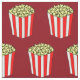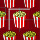 Cool movie theatre fabric with cute popcorn boxes with yellow popped corn in a red and white striped package. Fun red background for a night with the stars. Make cool film curtains or clothes with this fun pattern.