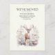 "We've moved" change of address / moving announcement postcard with the painting of a deer with large antlers in the forest.