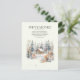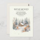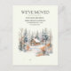 "We've moved" change of address / moving announcement postcard with the painting of a log cabin in the snow at the edge of a forest.