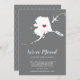 Modern moving announcement featuring the state of ALASKA with a red heart & aeroplane set on a grey background. The background colour can be changed easily by clicking personalise and then click to customise further to view our colour picker. From there you can also move the aeroplane & heart! Contact our shop if you require help or need another state.