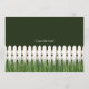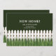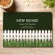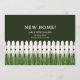 New home announcement with white picket fence and grass.
