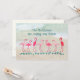 New address flat card announcement with envelopes. Announce a move to Florida, or a tropical location, with these coastal themed cards. Seven pink flamingos stand among little blue sea stars on the front over a beach sand background. Sample text is, “[Name, or names, here] is / are making new friends” and continues on the back. All text is added in paragraph form to include as much as you need and mails in an envelope to keep things private. A white starfish decorates the back with another beach scene background. Perfect for singles, couples, families and retirees. This card offered paper upgrades and size selections. The design will not work on all sizes and will print as you see it.