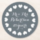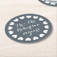 Personalised Mr and Mrs 25th wedding anniversary round pulp coasters. Elegant wedding day party supplies for married couple, husband and wife or newly weds. Customisable number of years like 1, 5, 10, 25, 40 etc. Personalizable colours ie grey and white. Vintage calligraphy handwriting typography design with little love heart circle border. Add your own surname. Custom accessories and decorations for your venue. Part of matching set with disposable cups and plates.