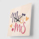 Square wall clock with the words "Mr. & Mrs" in a playful, cartoonish font. The word "Mr." is written in a deep blue color, while "Mrs" is in a vibrant pink. The ampersand is in a golden yellow color. There are small hearts and a bow tie scattered around the text, adding to the whimsical feel. The clock hands are black and simple in design. The background is a soft, creamy color, which makes the text and decorations stand out. The overall style is cheerful and celebratory, perfect for a wedding or anniversary gift.