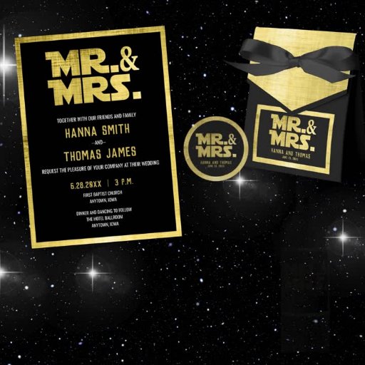 Introducing our Sci-Fi Themed Wedding Sticker, a perfect blend of cosmic elegance and futuristic charm for your special day. This exquisite round sticker features a mesmerising space galaxy black background, adorned with a brushed gold look that creates a stunning contrast. The bold "MR. & MRS." text takes centre stage, crafted in a sleek, modern font that exudes sophistication and a touch of sci-fi allure.