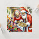 Cute watercolor style ai art illustration of Mr and Mrs Santa Claus offering chocolate cookies to the elves who have been working very hard! Cute nostalgic holiday personalised Christmas card.