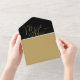 This all-in-one minimalist wedding invitation features elegant gold typography on a black background. The invitation includes a perforated RSVP card with your wedding website QR code. Designed by Thisisnotme©