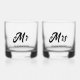 Wedding gift for the newlywed bride and groom! Whiskey glasses that feature the word Mr on one glass and Mrs on the other glass, printed in black, stylised lettering along with their married last name. Personalise your glassware by editing and replacing names on each whiskey glass.