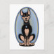 Cartoon Doberman Pinscher, sitting and staring intently, with a particularly Dobe-ish engaging expression. Oval backing with golden rays, colour, t-shirts, cards, gifts.