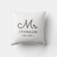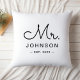 For the bride and groom, this throw pillow features "Mr." and "Mrs." in an elegant, modern script font along with a last name and established date. This is a perfect bridal shower or wedding gift.
