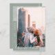 Mr. and Mrs. Sage Green and White Script Photo Save the Date Card. Stylishly impress your guests with this stylish, simple, moss green, photo wedding save-the-date card, with a modern white script over a bokhe sage green background, stylishly showing the date of the wedding horizontally along the left, alongside a personalised photo of the married couple to be, with a simple silver line element across the right-hand side. Then a plain minimal moss green back of the card, with simply the names and place of the married couple to be in an elegant white font. This minimal wedding save-the-date card gives an elegant, modern feel to your sage green wedding.