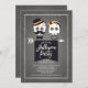 Vintage gothic halloween party invitation featuring Mr. & Mrs. skulls with a banner sign with a hand lettered calligraphy font set on a grey background.