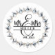 This round shape sticker is shown with a custom name Mr. & Mrs. print, personalise and change the name and year to yours with this template.