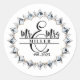 This round shape sticker is shown with a custom name Mr. & Mrs. print, personalise and change the name and year to yours with this template.