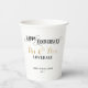 Personalised wedding anniversary paper cups with calligraphy in black and gold. The design is lettered with Happy Anniversary Mr & Mrs .. and you can customise with last name and text such as, going strong since [year].