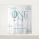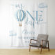 This charming first birthday party photo backdrop features a cute blue hot air balloon and clouds, along with elegant script typography. Designed by Thisisnotme©