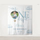This charming first birthday party backdrop features a cute photo hot air balloon and blue clouds, along with elegant script typography. Designed by Thisisnotme©