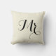 Mr. Pillow in black on light beige background colour, with striped black and light beige back. Part of a Mr. and Mrs. pair. Customisable. Background colour, text, and text colour can be changed.