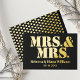 This elegant lesbian wedding guest book showcases a stunning design with elegant gold foil accents, prominently displaying the titles "Mrs. and Mrs." in stylish bold typography. The design is further enhanced by a beautifully crafted ampersand, accompanied by a circular motif that features a gold love heart in place of a traditional period. The background is of black colour.