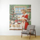 In a cosy, snow-covered kitchen, Mrs. Claus is captured in the midst of holiday baking. Dressed in a festive red dress with fur-trimmed sleeves, and a matching apron, she smiles warmly as she prepares a fresh batch of cookies. The scene is filled with Christmas cheer, complete with a beautifully decorated tree adorned with candy canes and red ornaments, while snow gently falls outside the window, adding to the magical atmosphere of the season.