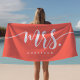 Mrs Coral And White Newlywed Bride Personalised Beach Towel. Modern script personalised name beach towel. Perfect honeymoon towel for the bride. Personalise this custom design with your own name or text.