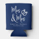 Give your wedding guests a toast and a fun souvenir keepsake of your special day with these custom navy blue can coolers with "Mrs & Mrs" written in a large white script and an illustration of two diamond wedding rings joined together. Add your names and wedding date.