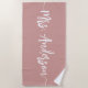 Celebrate your new bride status with this custom dusty rose blush pink beach towel featuring your new last name in white hand lettered signature script lettering with beginning and ending swashes. Makes a great wedding, shower or honeymoon gift.