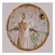 A digital painting of a Smew in a pink flapper dress with lace necklaces. There is a chair with a white dress and hat resting on it. An antique silhouette portrait of a duck head in a dark brown round wooden picture frame, hangs on the wall. The wall is pink wallpaper with tropical birds. The artwork is placed inside a decorative round carved frame that has a few carved flowers on it.
