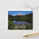 A gorgeous photo of Mt Hood reflected in Mirror Lake with pink wildflowers in the foreground.