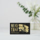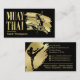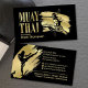 A dramatic Muay Thai business design in black and gold, showcasing a powerful fighter illustration against bold brush-stroke textures. The front highlights the Muay Thai title with strong typography, while the back includes a striking kicking silhouette alongside trainer details, contact information, and class offerings. A standout choice for Muay Thai coaches, personal trainers, and combat sports professionals who want a modern, high-impact look.